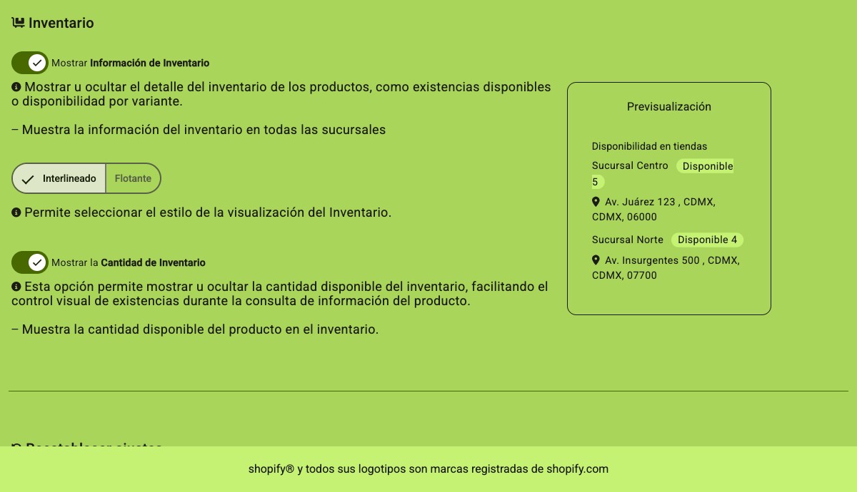 Mostrar u ocultar el detalle de las sucursales asociadas al inventario, como la ubicación física, sucursal o punto de almacenamiento donde se encuentra disponible el producto.